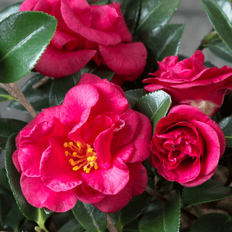 Bella Rouge’s very compact growth habit is perfect for small spaces. Its red semidouble blooms appear in November through December.