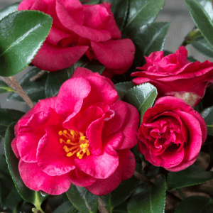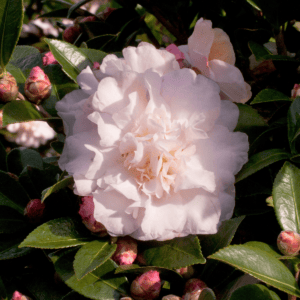 Bursts with pure white blooms in spring, and sporadically through summer and fall; displays dense, glossy-green foliage with lime green new growth. Layered growth habit requires little pruning.